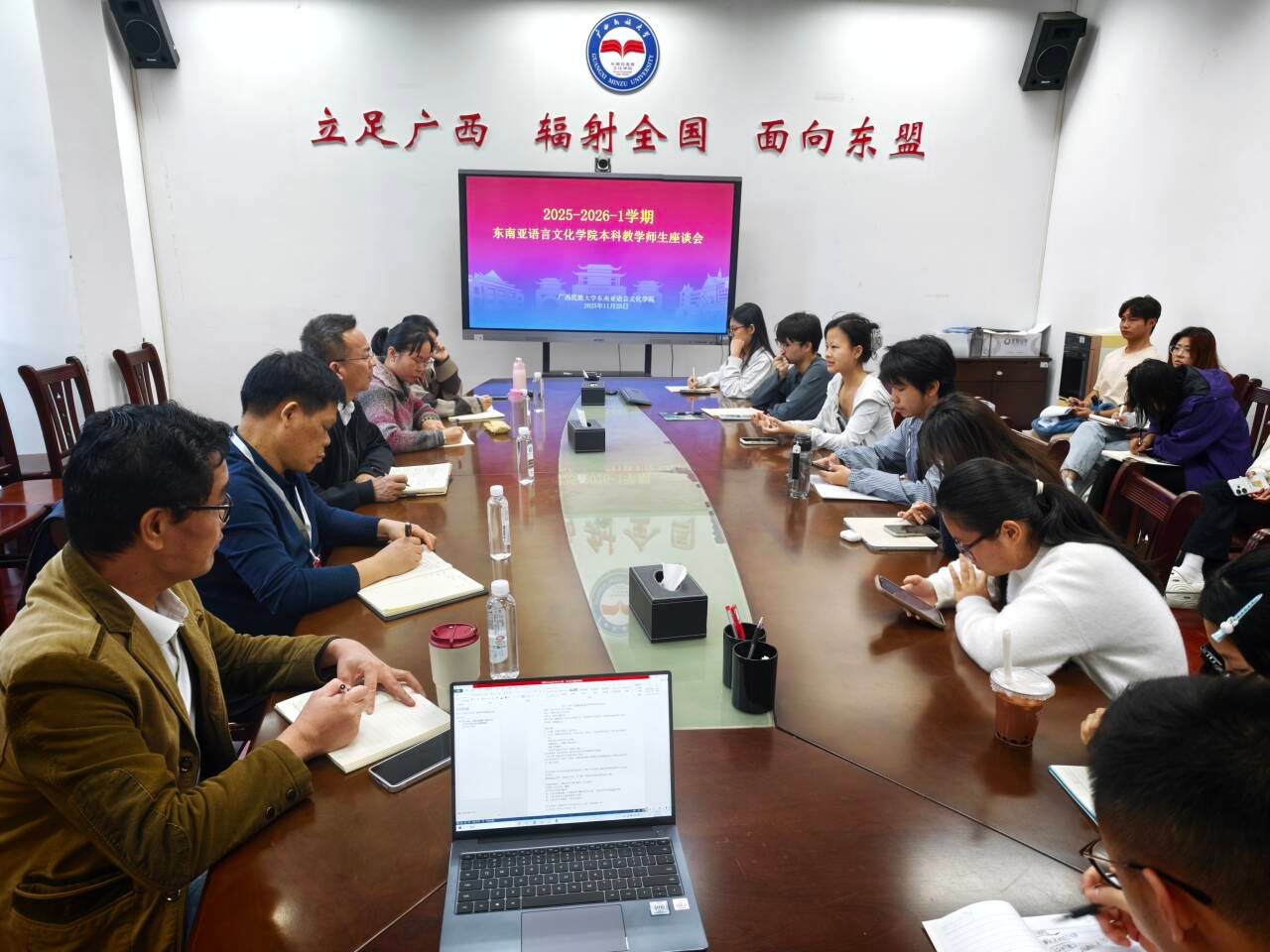 11月25日下午,william威廉中文官网在东盟主楼118会议室举行2025-2026学年第一学期本科教学师生座谈会。会议由副经理黄伟生主持,校级督导组主任吴胜富、校级督导韦长福老师及院级督导欧江玲老师、欧曼老师到场聆听同学们的意见与建议,各专业各年级员工代表共同参加。